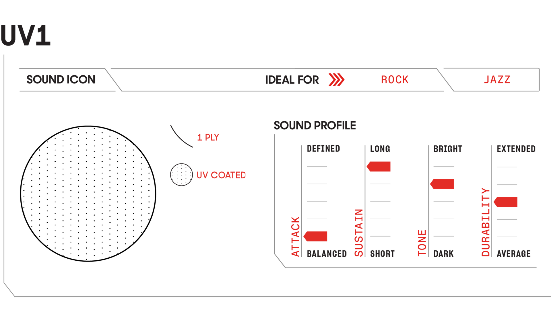 The UV1 drumhead is the most versatile and durable single ply head ever made. A single ply of 10mil film delivers a full range of musical expression while the patented UV-cured coating provides unmatched durability and consistency. UV1 tom heads have a very balanced attack, long sustain, moderate brightness, and increased durability over the average single ply. This coated drumhead also features Level 360 Technology.